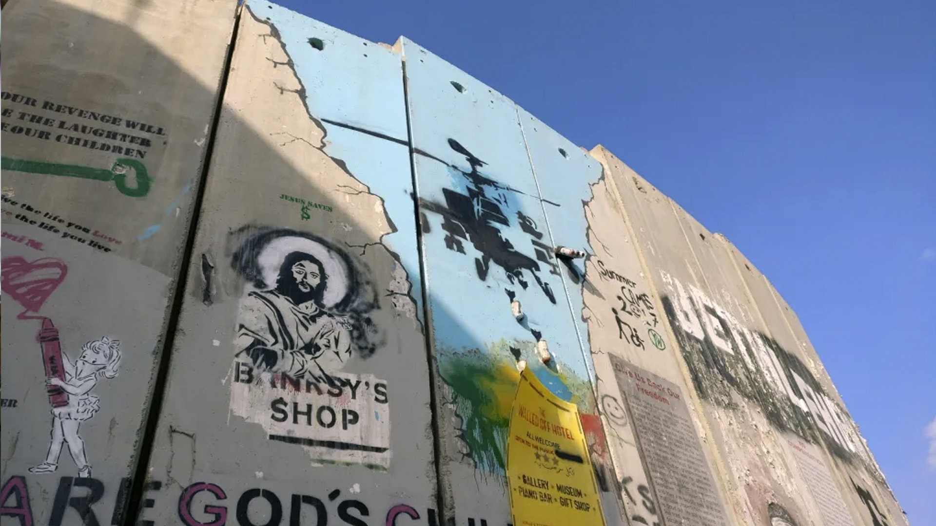Banksy’s numerous murals painted on the Separation Barrier in Bethlehem in 2005 offer a powerful artistic response to the controversial structure’s physical and symbolic impacts, which Israel began constructing between the occupied West Bank and Israel in 2002.