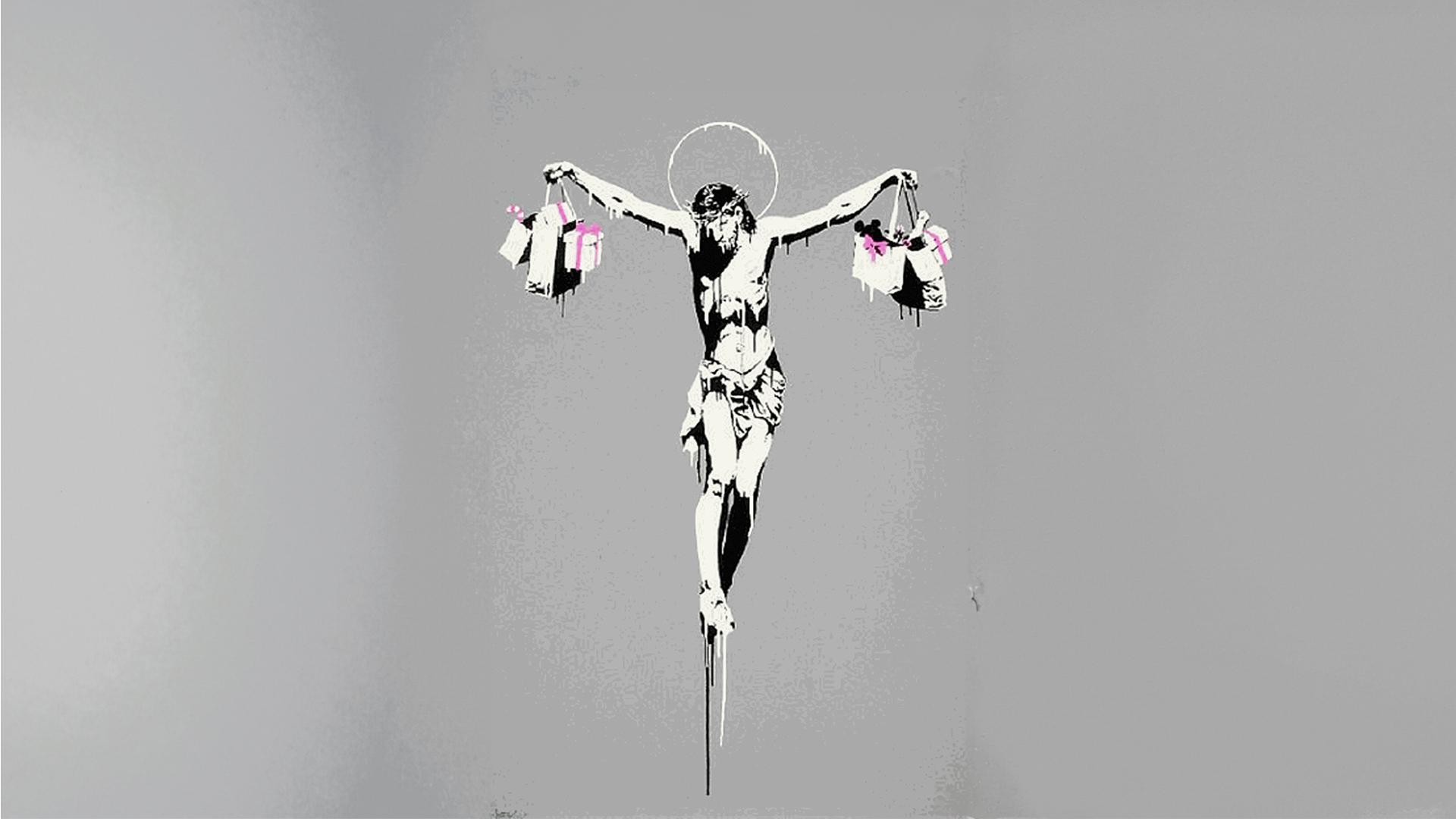 At the centre of the piece, against a grey background, stands the black-and-white figure of Christ; crucified without a cross, pink-ribboned shopping bags hanging from his outstretched hands. The bags are filled with Christmas gifts, candy canes and Mickey Mouse ears. The composition is minimalist yet striking: a religious icon distorted by commercial objects; muted colours create a bleak atmosphere.