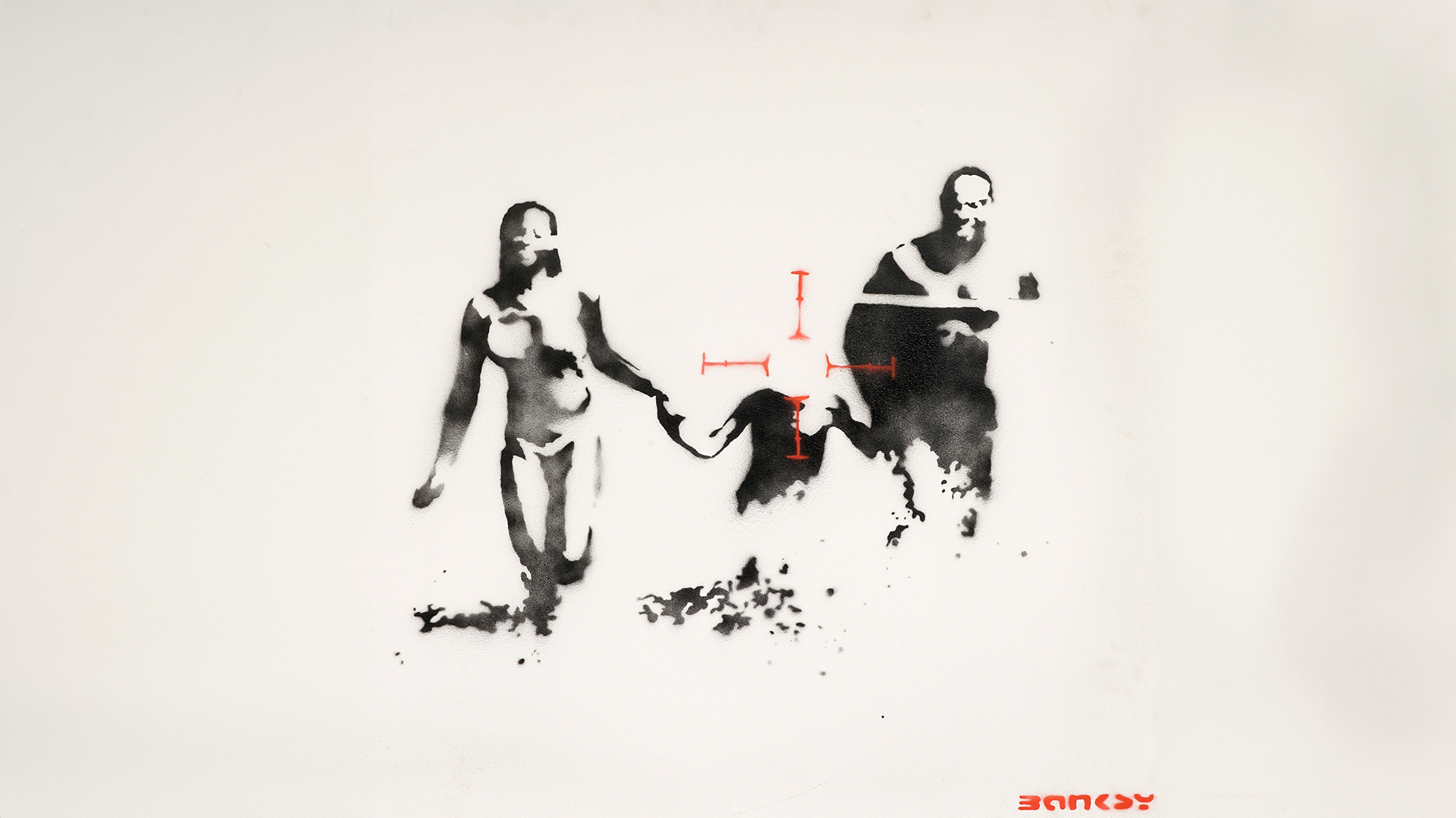 The work critiques the collateral damage of modern warfare, the refugee crisis and the violence of capitalism. By taking the concept of ‘family’ both literally and metaphorically as a target, Banksy underlines the normalisation of violence.