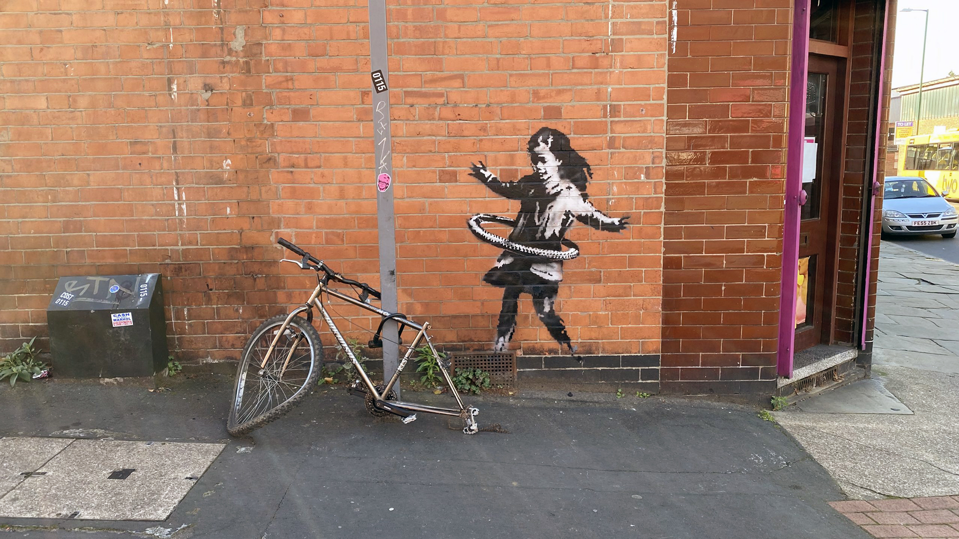 The artwork portrays a young girl hula-hooping with a bicycle tire; right beside her stands a real bicycle, chained to a streetlamp, missing its rear wheel. The missing wheel is repurposed as the hula hoop in the girl’s hands a detail that reflects Banksy’s approach of transforming broken or discarded objects into an artistic context.