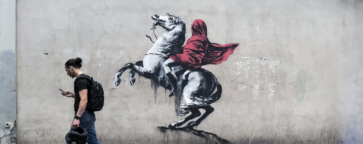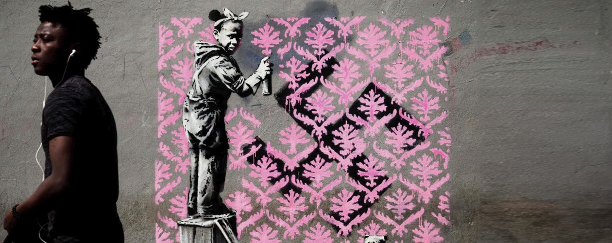 He questions the humanity of the refugee crisis and Europe’s migration policies; while the girl holds the lifebuoy, she symbolises the innocence of children at sea and lives awaiting rescue. The pink colour creates a contrast between hope and danger. The work criticises states’ policy of ‘leaving refugees in the middle of the sea’. By naming it after anarchist Louise Michel, Banksy emphasises solidarity against authority.