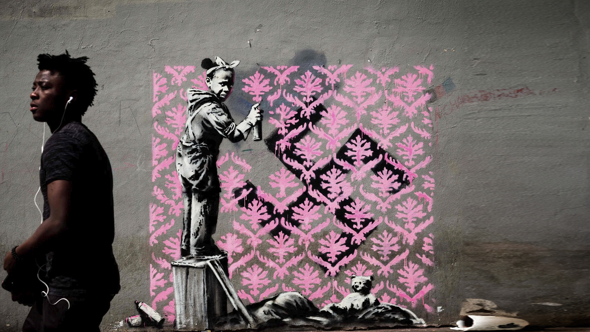The mural depicts a young refugee girl, on the ground with her teddy bear, trying to erase a Nazi swastika with a pink pattern. Black-and-white tones create a dramatic effect, while the pink pattern symbolizes hope and resistance. However, vandals later altered the mural to make it seem as if the girl is drawing the symbol; still, Banksy’s intent is clear: to expose the ongoing social and political imbalance affecting displaced populations. Its placement on the soup kitchen wall ensures the message reaches the migrants’ living space directly.