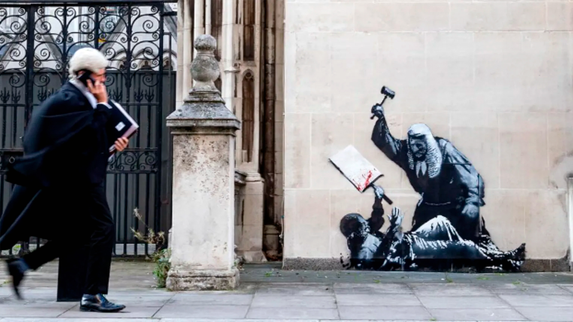 The composition is minimalist and tense: Banksy uses stencil technique with minimalist contrast and dynamic composition. The contrast between the judge’s dominant posture and the protester’s passivity intensifies the visual irony, and the only colour accent is the red bloodstains.