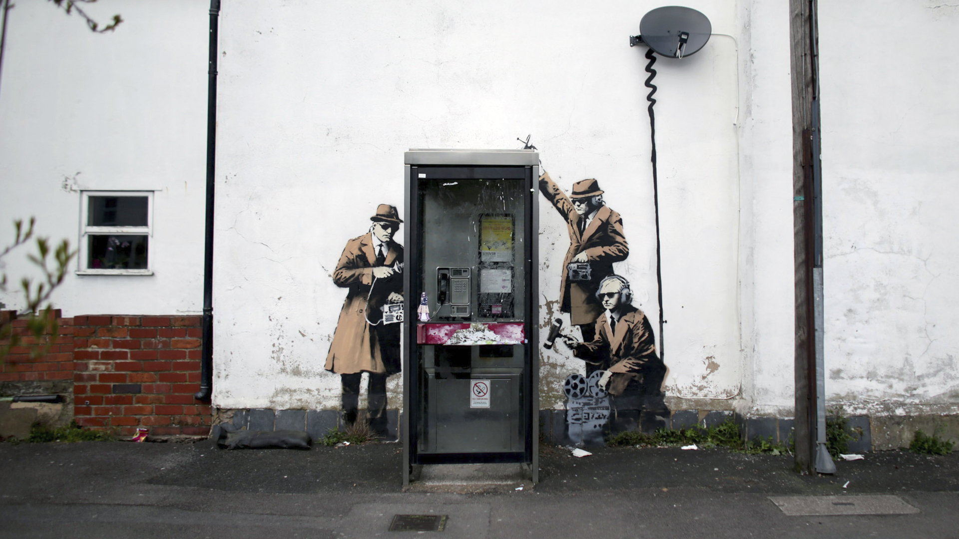 Drawn in 2014 in Cheltenham, England, near the Government Communications Headquarters (GCHQ) on a wall next to a phone booth, Banksy’s Spy Booth is an impactful mural offering a sharp critique of mass surveillance and government overreach.