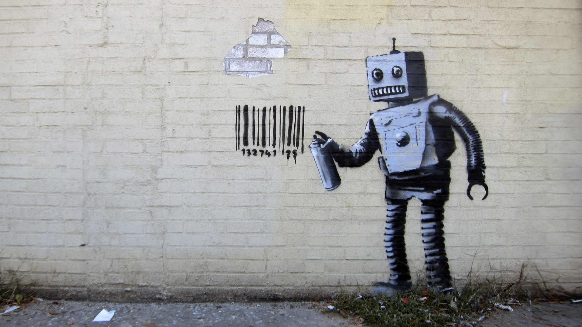 Seine Platzierung in einem öffentlichen Raum zeigt Straßenkunst als eine Form des Widerstands, doch der Roboter, der einen Barcode zeichnet, kritisiert, wie selbst Straßenkunst von der Konsumkultur vereinnahmt werden kann. Das Werk fordert die Betrachter auf, darüber nachzudenken, wer urbane Räume kontrolliert und wie individuelle Freiheiten in der modernen Welt bedroht sind, während es auch fragt, wie Technologie Kreativität formt.